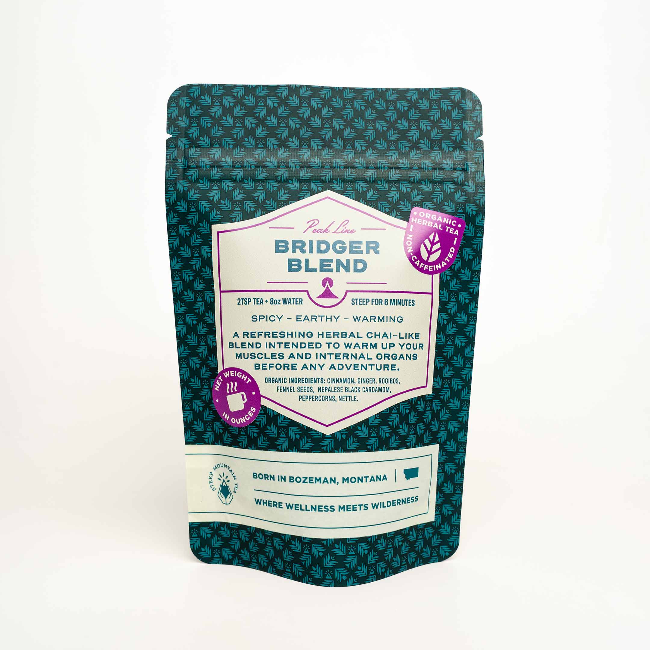 An all-day refreshing tonic reminiscent of chai and crafted to perk you up without caffeine. Perfect for warming up your muscles and internal organs before hitting the steeps of the Bridger Ridge or any aerobic adventure.